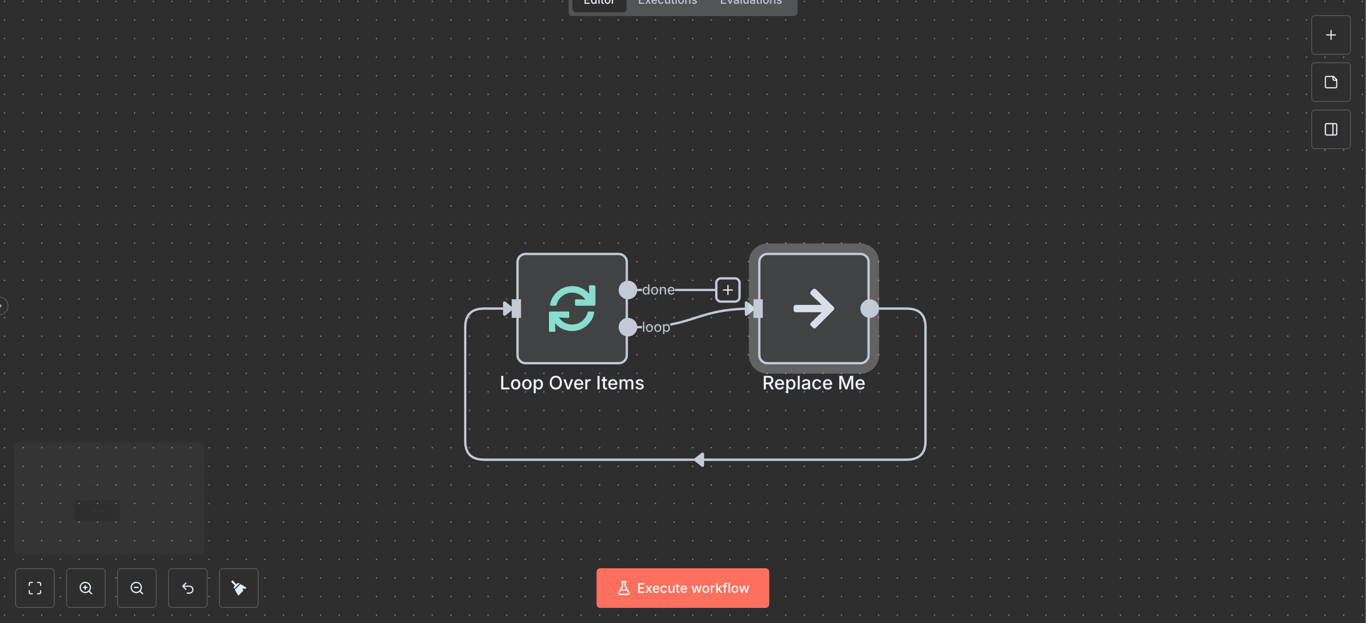- 闭环:处理完当前批次的逻辑后,必须把连线连回到 Loop Over Items 节点的输入侧(通常是它的左侧或自身),告诉它:“这一批处理完了,给我下一批。”